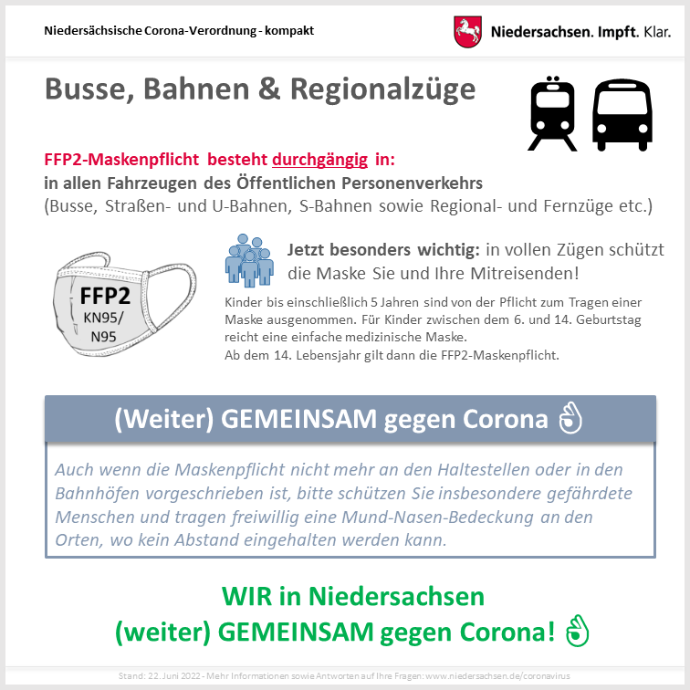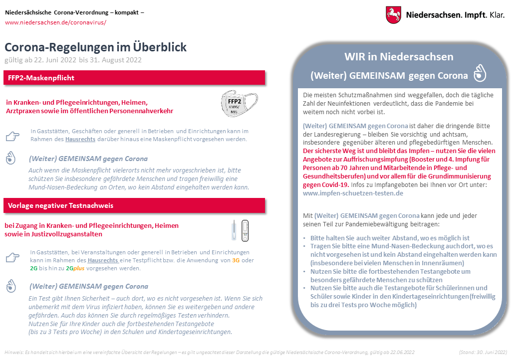 Niedersächsische Corona-Verordnung – gültig ab 22. Juni 2022 bis 31. August 2022:Niedersächsische Verordnung über infektionspräventive Schutzmaßnahmen zur Eindämmung des Coronavirus SARS-CoV-2 und dessen Varianten (Niedersächsische Corona-Verordnung) - in der Lesefassung gültig ab 22. Juni 2022 bis 31. August 2022